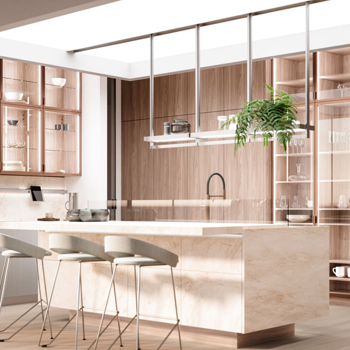 A composite front from the natural stone programme. The support panel is an 8 mm thick, melamine coated CDF-panel bonded with approx. 12 mm thick natural stone. The front edges are covered overleaf with original natural stone and bevelled along the edges. The front material has a grained pattern within the respective cupboard.