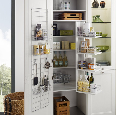 Storage Unit Pantry (Wire Basket with Glass Bottom): The pantry door opens to reveal the entire set of shelves, offering immediate access. Adjustable wire baskets with glass bottoms provide clear visibility of stored items from every angle.